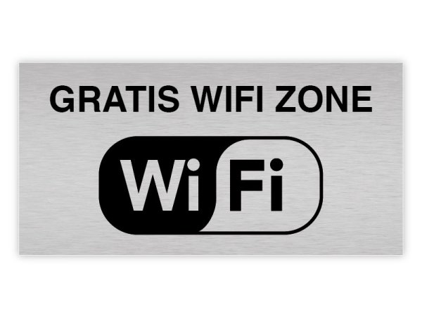 Handig wifi bordje van geborsteld aluminium. Dit bordje heeft een afmeting van 10 x 5 cm en is voorzien van een zelfklevende achterzijde.
