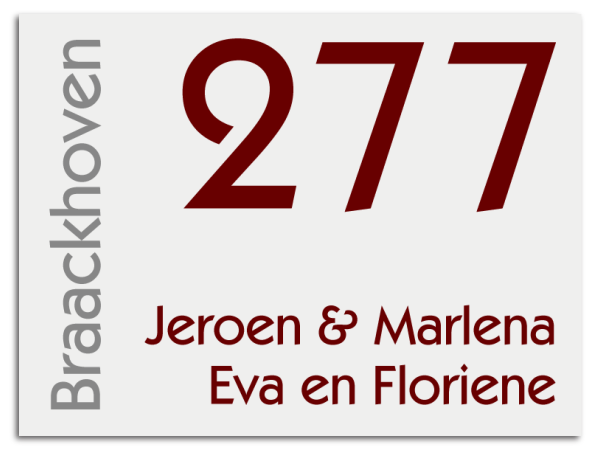 Voor het maken van dit naambord maken we gebruik van een de beste kwaliteit aluminium. De glanzende toplaag beschermt je ontwerp tegen weer en zonlicht en zorgt voor een fraaie weergave van de gebruikte kleuren.
