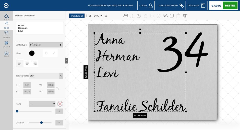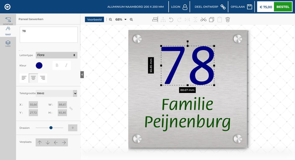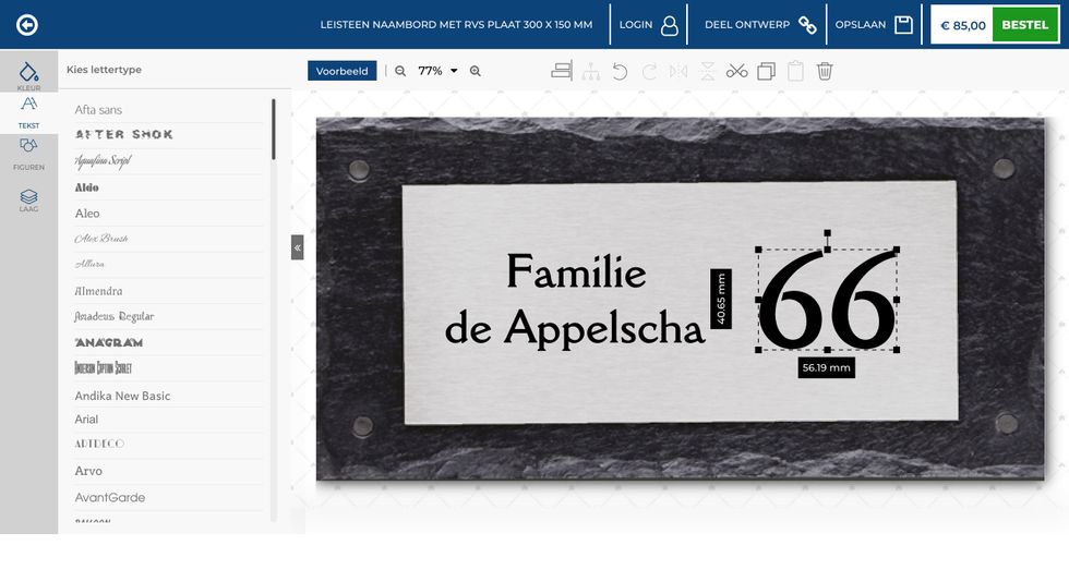 De mogelijkheid om zelf je naambord te maken met de ontwerpmodule is geweldig. Al je ideeën verwerken in een zelf te ontwerpen naambord. Niemand die zegt of het mooi is of niet. Dat kan perfect werken maar voor veel mensen is het lastig om net dat ene ontwerp te maken waar je blij van wordt. Wel belangrijk want tenslotte wil je dat het naambord bij je voordeur vaak voor langere tijd.