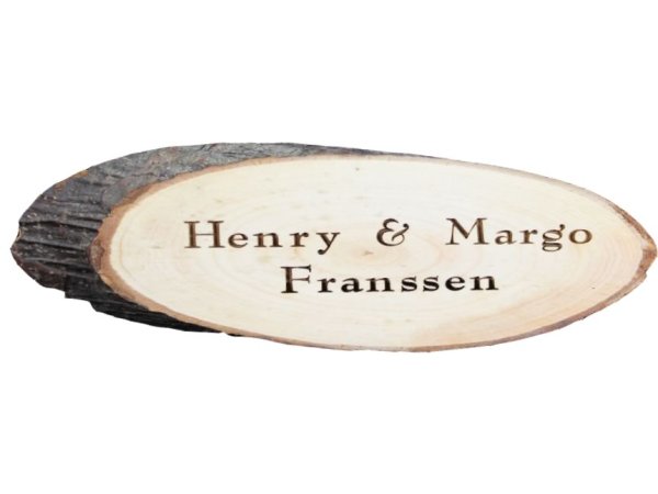 Is dit houten naambord iets voor bij jouw voordeur? Dat bepaal je helemaal zelf. Je kan dit boomschijf naambord gebruiken als naambord bij de voordeur maar ook als leuk geschenk met een persoonlijke tekst. Met de ontwerp-module bepaal je helemaal zelf wat er op dit houten naambord komt te staan We graveren de opdruk door middel van een laser. De opdruk wordt ingebrand en heeft daarom altijd een donkere kleur. Het is hierdoor niet mogelijk om met andere kleuren te werken.