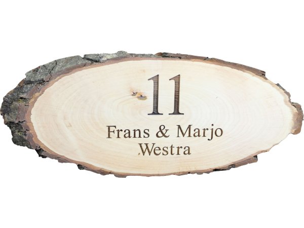 Een boomschijf naambord is bij uitstek geschikt om op te hangen bij de voordeur. Het hout geeft een gemoedelijke en warme uitstraling. De opdruk wordt donkerbruin van kleur. De opdruk wordt namelijk door middel van lasergraveren aangebracht. Een laser brand met hoge precisie het ontwerp in het hout. Vervolgens wordt het naambord afgelakt voor een mooi egaal effect en langere levensduur.