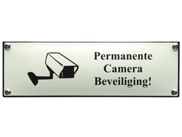 Dit emaille tekstbordje is voor zien van een camera pictogram en de tekst "Permanente camera beveiliging". Dit emaille bordje is perfect wanneer je op zoek bent naar een manier om mensen te attenderen op camera beveiliging.
