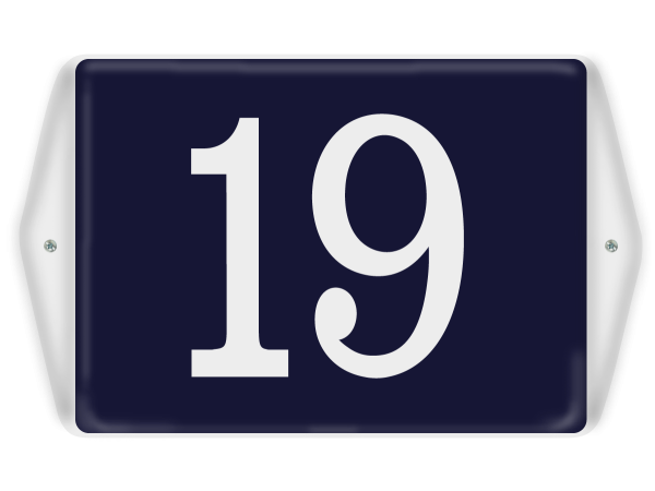 Dit emaille huisnummerbord is een model met oor. Dat wil zeggen dat het huisnummer aan de zijkant twee uitsteeksels heeft waar zich de schroefgaten in bevinden. Het deel waar het huisnummer op staat heeft een afmeting van 16 x 12 cm. De oren zijn in totaal nog 3 cm waardoor de werkelijk breedte 19 cm is.