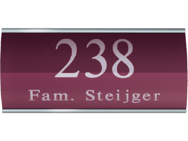 Dit kunststof naambord in een frame van aluminium wordt gemaakt van gravoglas. Dit is een gelaagd kunststof dat speciaal is gemaakt om te graveren. De bovenste laag is transparant en de onderste laag bevat de kleur. Na het verdiept graveren wordt het uitgespaarde deel ingelakt met de gewenste kleur. Hierdoor ontstaat een goed leesbare gegraveerde opdruk. Omdat de transparante toplaag niet wordt gegraveerd wordt de opdruk nog beter beschermd.