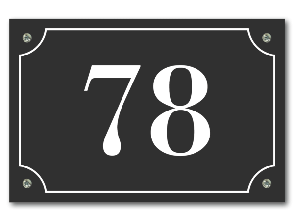 Om dit huisnummerbord een moderne of klassieke stijl te geven kan je een sierkader laten graveren. We kunnen bij dit model een sierkader met ronde hoeken of negatieve hoeken aanbrengen. Natuurlijk is het achterwege laten van een sierkader ook mogelijk.