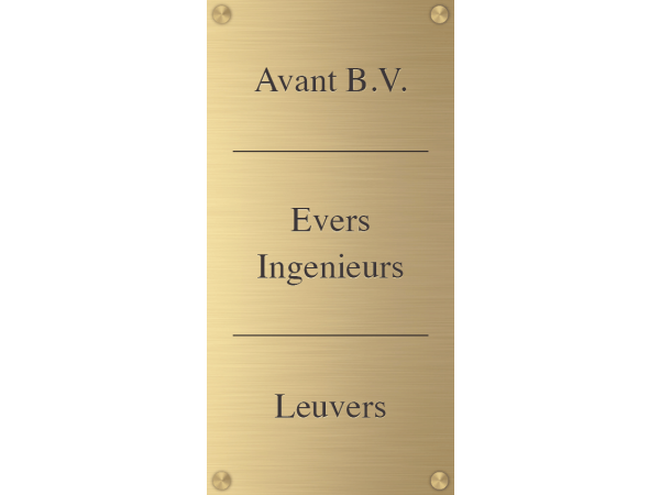 Dit Messing bedrijfsnaambord van 15 x 30 cm wordt gemaakt van een schitterende licht geborsteld Messing met een dikte van 1,5mm. De opdruk wordt verdiept gegraveerd en vervolgens met de gewenste kleur ingelakt. Deze techniek staat garant voor een prachtige en permanente opdruk die niet vervaagt.