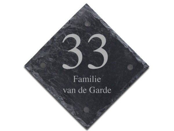 Dit prachtige naambord heeft een vierkante vorm maar gedraaid waardoor het een ruit wordt. Dit naambord van leisteen (natuursteen) is 8 mm dik en heeft van oorsprong grillige vormen. Deze natuurlijke vormen maken ieder leistenen naambord weer uniek.