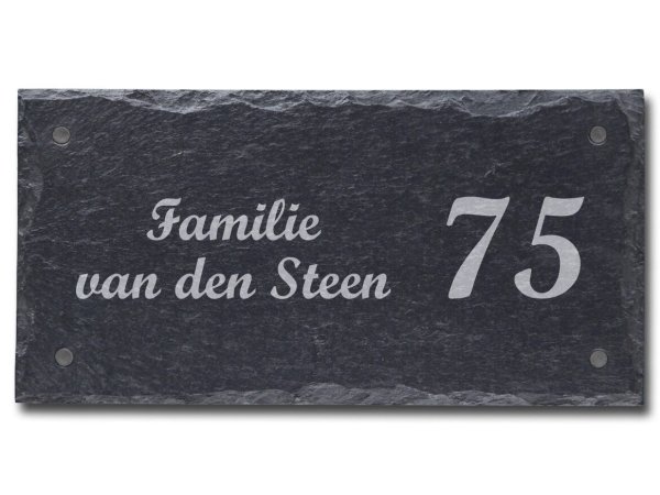 Dit Leistenen naambord heeft grove afgekapte randen waardoor het een robuuste uitstraling krijgt. De afmeting is 30 x 15 cm en wordt voorzien van een lasergravure. Middels een zeer lasergraveermachine wordt de gewenste opdruk zeer nauwkeurig in het leisteen gebrand. De kleur van de tekst wordt lichtgrijs.
