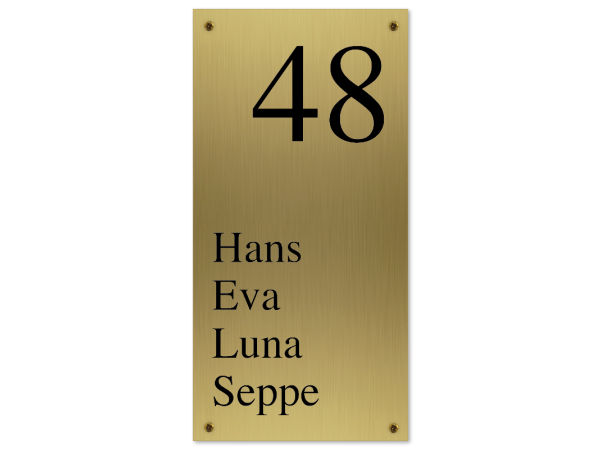 Dit naambord maken we van messing met een licht geborstelde structuur. We noemen het meestal messing maar soms wordt het ook wel koper of geelkoper genoemd. Hoe we het materiaal ook noemen, messing is een schitterend materiaal. Zelf vinden we dat het door de jaren heen alleen maar mooier wordt.