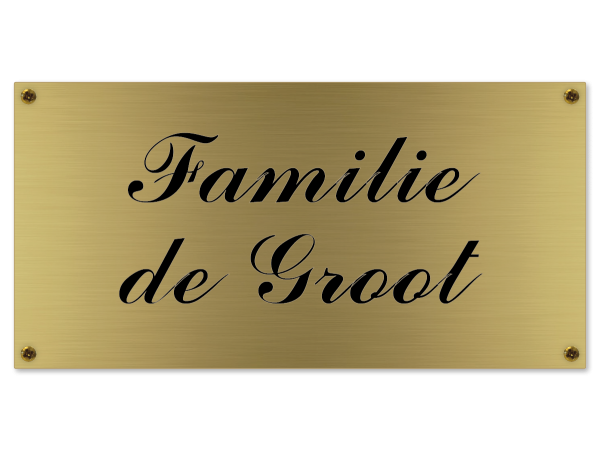 Dit luxe messing naambord wordt vervaardigd uit een mooie hoge kwaliteit messing met een dikte van 1.5mm. Dit type messing heeft een schitterende glans en een fijne geborstelde structuur. De opdruk wordt eerste verdiept gegraveerd en daarna zwart ingelakt. Door het inlakken krijgt de opdruk een permanente en diepe zwarte kleur die niet zal vervagen.