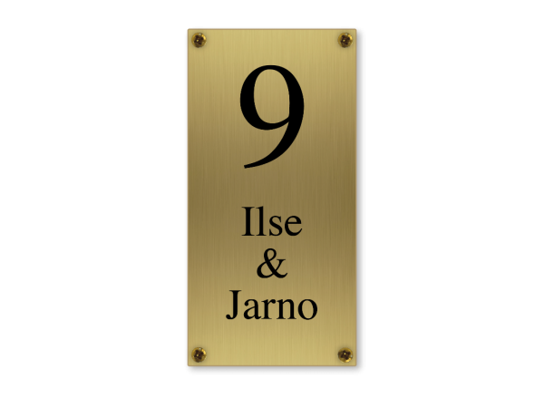 De afmeting van het messing naambordje is 6 x 12 cm en je kan het bevestigen doormiddels van goudkleurige schroeven, luxe afdekdopjes of een zelfklevende achterzijde. We adviseren de zelfklevende optie alleen wanneer je dit bordje op een gladde ondergrond kan aanbrengen.