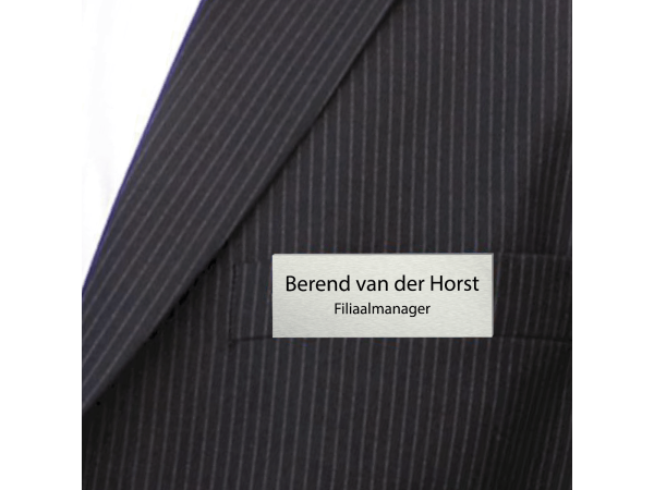 Met deze luxe rvs look naambadge van aluminum met een opdruk in kleur kom je mooi voor de dag. Deze badge heeft een afmeting van 8 x 3 cm en biedt voldoende ruimte voor bijvoorbeeld een klein logo, naam en functie.