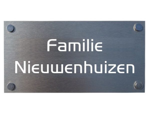 Dit mooie naambordje met rvs uitstraling en een afmeting van 20 x 10 cm x 2 mm (dikte) is gemaakt van geanodiseerd Aluminium. Geanodiseerd betekent dat het Aluminium wordt behandeld zodat het bestand is tegen corrosie en lang mooi blijft. De luxe afwerkdopjes zorgen voor een mooie luxe afwerking waardoor de schroeven niet zichtbaar zijn.