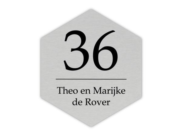 Dit naambord kenmerkt zich door zijn bijzondere vorm. Wil je een een naambordje met een unieke vorm, dan is dit hexagon naambord een een goede keuze. We maken het naambord van aluminum met een geborstelde rvs-look toplaag. Samen met de 6-kantige vorm geeft dit het naambord een bijzondere uistraling.