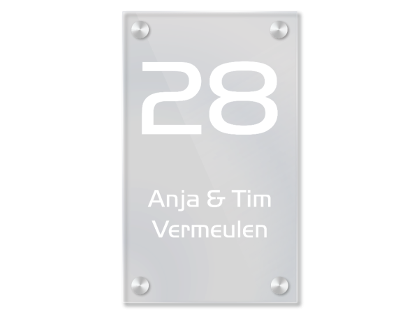We leveren dit naambordje van 15 x 25 cm met een luxe bevestigingsset. Deze set bestaat uit 4 rvs afstandhouders met schroeven en pluggen. Deze afstandhouder zorgen dat het naambordje 1,5 cm van de muur komt.