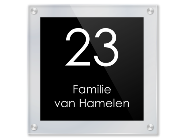 Dit chique plexiglas naambordje maken we van 5mm dik glashelder plexiglas. Het is weerbestendig en wordt geleverd van een luxe rvs bevestiging. De afmeting is 30 x 30 cm.