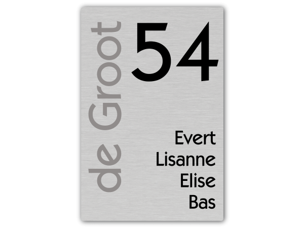 Dit mooie RVS look naambord wordt gemaakt van een hoge kwaliteit Aluminium. Door de geborstelde structuur heeft dit naambord een luxe uitstraling. De speciale coating geeft dit naambord een schitterende glans en de opdruk een diepe kleur.