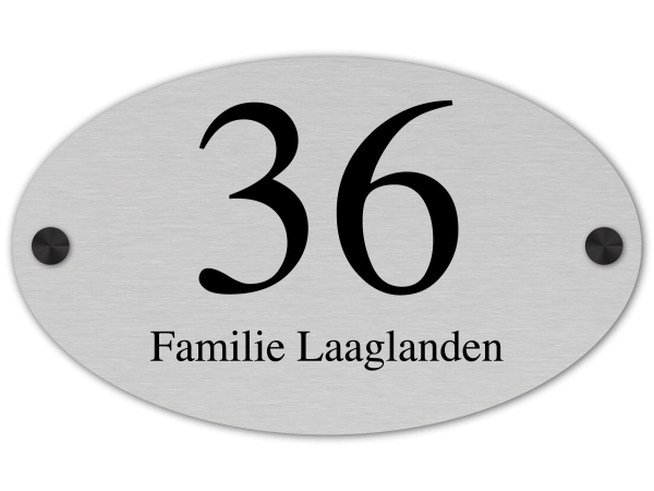 We maken dit naambordje van aluminium met een geborstelde rvs look toplaag. We frezen dit model in een ovale vorm en we brengen links en rechts boorgaten aan zodat dit naambordje met 2 zwarte rvs afstandhouder tegen de muur bevestigd kan worden. Deze stoere en robuuste zwarte afstandhouders zorgen voor een afstand van 1,5 cm tussen de muur en en het naambord.