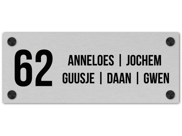 Dit leuke naambord met een afmeting van 30 x 12 cm heeft dankzij de rvs look toplaag en zwarte afstandhouders een gave uitstraling. We maken dit naambord van een buitenkwaliteit Aluminium met een mooie geborstelde laag en licht afgeronde hoeken.