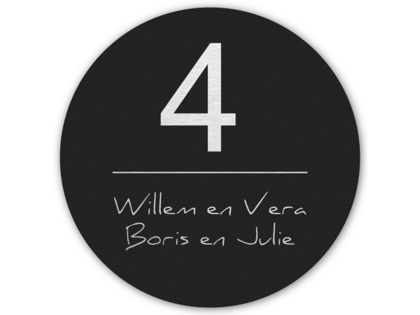 Dit ronde naambordje heeft afmeting van 30 cm. De matzwarte toplaag vormt een prachtig contrast met de zilverkleurige rvs-look opdruk. We gebruiken als basis voor dit naambord aluminium met geborstelde rvs-look toplaag. Op de de delen met opdruk wordt de onderliggende laag zichtbaar, wat zorgt voor een opvallend en stijlvol effect.