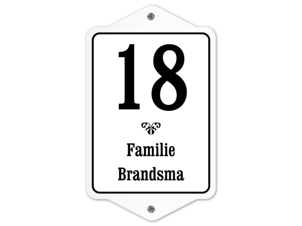 Dit klassieke naambordje is geïnspireerd op de traditionele emaille naamborden. De klassieke uitstraling wordt versterkt door de zorgvuldig gekozen kleuren, sierlijke lettertypes, elementen en de kenmerkende vorm met oren. Kies de beste afmeting voor bij jouw woning en kies uit 12 x 20 cm, 15 x 25 cm of 18 x 30 cm (inclusief oren), past dit bordje perfect bij elke stijlvolle woning.