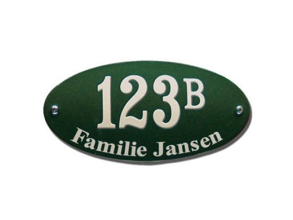 Dit leuke ovale en gebolde naambord van emaille heeft een afmeting van 20 x 10 cm. Het huisnummer wordt op dit naambord duidelijk weergegeven en de familienaam wat subtieler. Zo is in eerste instantie vooral snel duidelijk om welk huisnummer het gaat.
