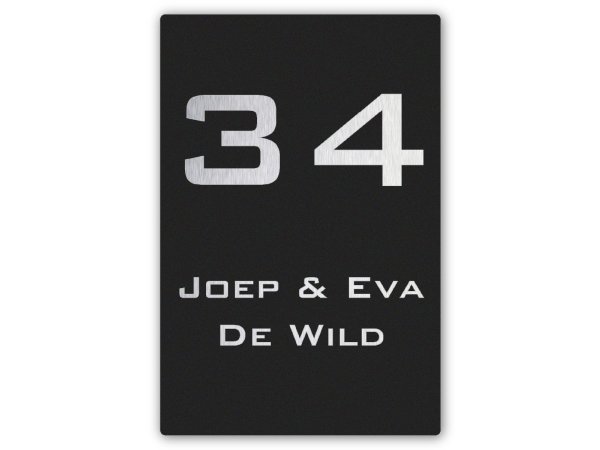 Dit stoere zwarte naambordje voor bij de voordeur heeft een afmeting van 10 x 15 cm. We maken het van aluminium met een rvs look toplaag die we helemaal zwart maken. Op de plek waar de opdruk staat wordt de rvs kleur zichtbaar. De combinatie van de rvs kleur en het zwart geeft dit naambordje een stoere industriële uitstraling.