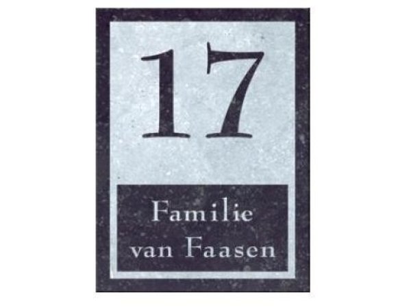 Dit bijzondere natuurstenen naambord straalt kwaliteit en luxe uit. Het bord wordt vervaardigd uit Belgisch Hardsteen. Hierdoor is ieder naambord van natuursteen uniek. Dit type natuursteen heeft een donkere toplaag. De opdruk wordt zeer nauwkeurig aangebracht middels moderne lasertechniek. Wanneer de opdruk wordt gegraveerd verdwijnt de toplaag en wordt de lichtgrijze kern zichtbaar.