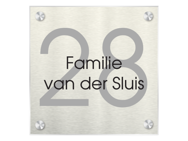 We leveren je naambordje compleet met rvs afstandhouders. Deze afstandhouders creëren niet alleen een ruimte tussen de voor- en achterplaat, maar zorgen ook voor een stevige bevestiging en een fraaie afwerking van het geheel. Kortom, dit naambord combineert stijl en functionaliteit op een meesterlijke manier.