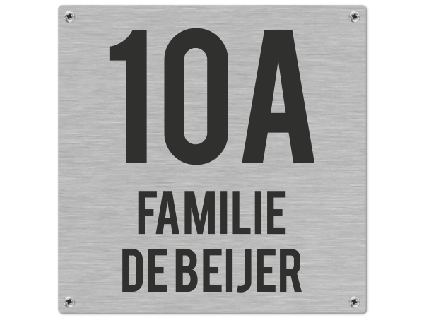 Dit stijlvolle RVS model heeft een afmeting van 15 x 15 cm en is voorzien van handige schroefgaten in de hoeken. Je ontvangt het naambord compleet met RVS schroeven en pluggen, zodat je het direct kunt bevestigen bij je voordeur. Dankzij het duurzame materiaal blijft het bord mooi, zelfs onder alle weersomstandigheden.