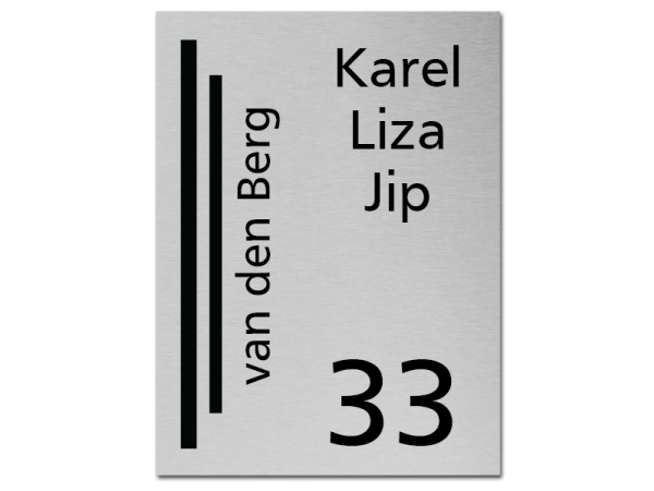 Dit naambord van rvs heeft een afmeting van 15 x 20 cm en is voorzien van twee uitsparingen aan de linker zijde. Hierdoor is de zwarte achterplaat zichtbaar en krijgt het naambord een bijzonder effect.