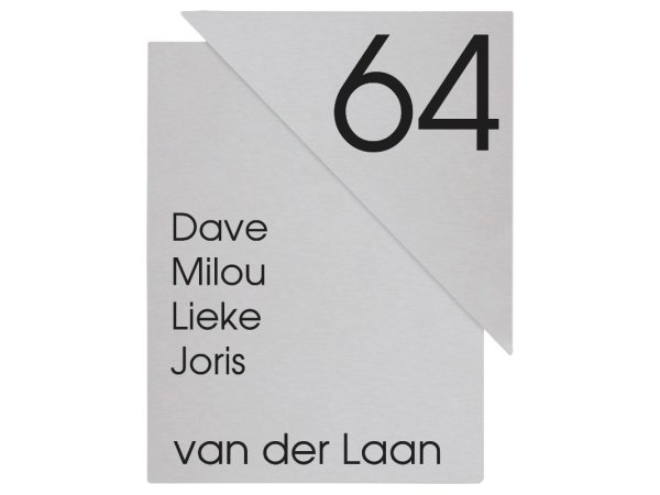 Kenmerkend aan dit rvs naambord is de opgelegde driehoek die eveneens van rvs is gemaakt. Dit geeft je naambord een leuke speelse uitstraling en diepte. Het naambord bestaat dus uit een achterplaat van 15 x 20 cm en een driehoek van 15 x 15 cm.