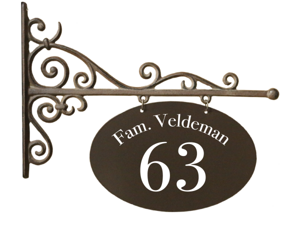 Dit uithangbord van gietijzer is een prachtige toevoeging voor aan de gevel. Dit uithangbord is een mooie toevoeging voor je woning, winkel of B&B. Met de handige ontwerp-module bepaald je zelf hoe je onderbord eruit komt te zien. Je hebt keuze uit verschillende lettertype, kleuren en afbeeldingen. En op verzoek kunnen we zelfs een logo aanbrengen.