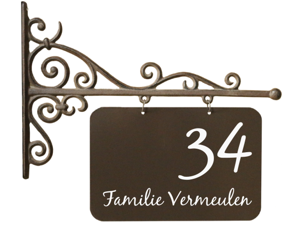 Dit unieke gietijzeren uithangbord voegt een vleugje elegantie toe aan de gevel bij je voordeur. Het bestaat uit een frame voor aan de muur met een onderbord. De totale afmeting inclusief frame bedraagt 41 x 26 centimeter.