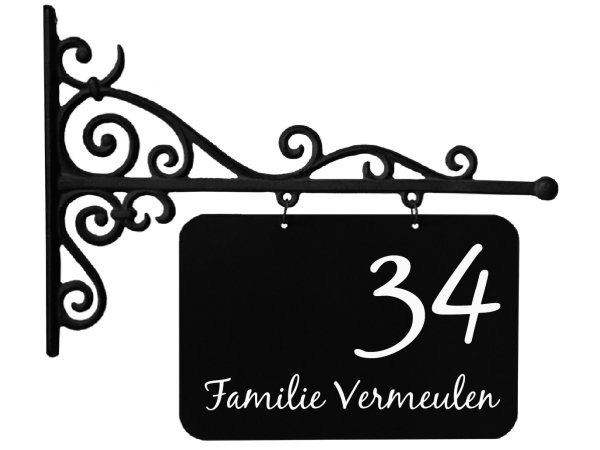Gietijzer is een herkenbaar materiaal met een nostalgisch karakter. Het is een staalsoort dat gegoten wordt. Het is weerbestendig, sterk en is nagenoeg onderhoudsvrij. Of je nou een winkel, bed en breakfast hebt of een naambord bij je voordeur zoekt. Je kan het onderbord voorzien van je naam, huisnummer of openingstijden. Op verzoek kunnen we zelfs een logo op het uithangbord aanbrengen. De totale afmeting inclusief onderbord is 41 x 26 cm.