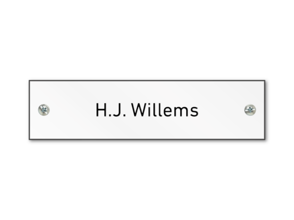 Door zijn formaat en uitstraling is dit naamplaatje perfect voor aan de voordeur, brievenbus, bellentableau of op kantoor. Ondanks de scherpe prijs is het bordje UV-bestendig, krasvast en geschikt voor buitengebruik. De tekst wordt verdiept in het oppervlak gegraveerd. De randen werken we standaard af met een nette facetrand. De dikte van het plaatje is 1,5 mm.
