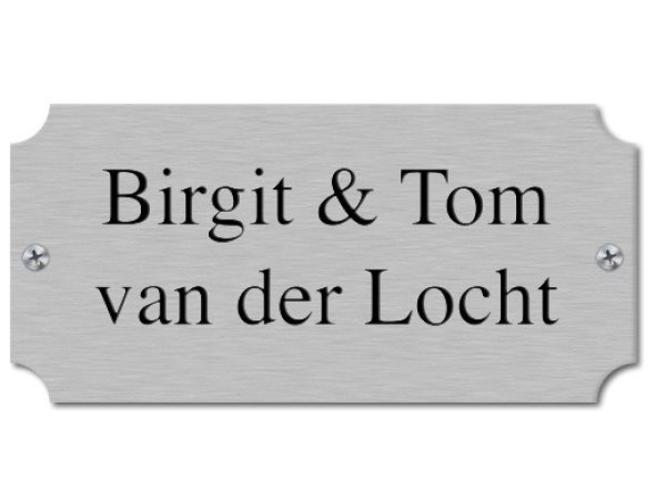 Aluminium sierplaatje met afgeronde negatieve hoeken. Dit naamplaatje is een combinatie van een nostalgische vorm gecombineerd met een modern en luxe materiaal.