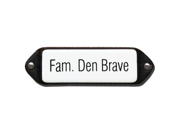 Dit kleine emaille naamplaatje is een oor model. De uiteinden lijken op oren. Deze oren voorzien deze naamplaat van schroefgaten waarmee je dit naamplaatje makkelijk kan bevestigen. Een andere eigenschap van een oor model is dat de bovenkant niet gebold is maar vlak is.
