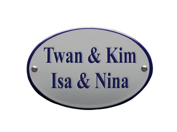 Over de levensduur van dit emaille naamplaatje hoef je je geen zorgen te maken. Een naamplaatje zoals deze gaat meestal tientallen jaren mee. We leveren dit ovale naamplaatje compleet met schroeven. Je kan het na ontvangst direct bevestigen aan de gevel of voordeur.