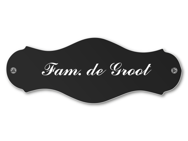 Dit kunststof naamplaatje is sierlijk, voordelig en onderhoudsvrij. We frezen het naamplaatje uit een kunststof soort die weerbestendig is. Het is een dubbellaags kunststof waarbij we de opdruk in de toplaag graveren. Hierdoor wordt de onderliggende kleur zichtbaar. Je kan kiezen uit verschillende kleuren kunststof.