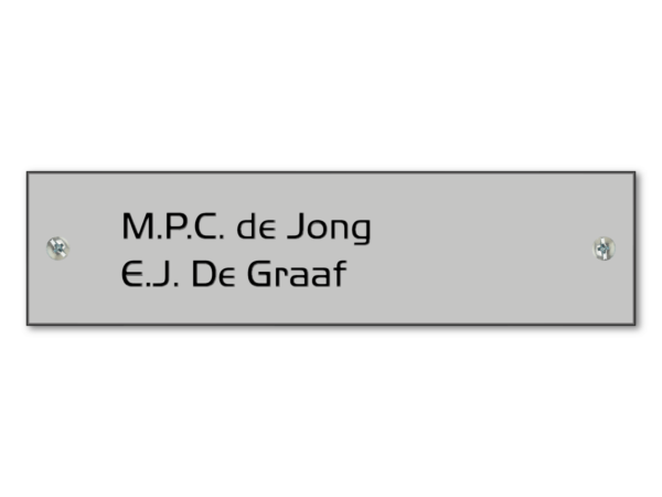 Wij maken gebruik van een hoge kwaliteit Kunststof met een dikte van 1,5 mm. Dit zorgt ervoor dat het naamplaatje weerbestendig is en vele jaren mee gaat.