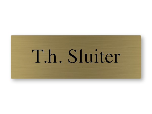 Het naamplaatje wordt vervaardigd uit graveermessing met een dikte van 1.5 mm. Na het graveren en lakken wordt het oppervlak zorgvuldig gereinigd en gegumd. Hierdoor ontstaat een lichte borstelstructuur die zorgt voor een nette uitstraling.