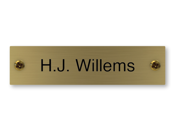 Het naamplaatje is gemaakt van graveermessing van 1.5 mm dik. Na de gravure wordt het oppervlak gereinigd en gegumd waardoor een subtiele borstelstructuur ontstaat.
