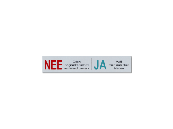 Kies nu ook voor dit unieke aluminium Ja Nee bordje. Dankzij dit aluminium Nee Ja bordje ontvangt u voortaan geen ongewenste reclame meer ontvangen. Het Nee Ja bord is gemaakt van hoogwaardig aluminium en is eenvoudig te bevestigen middels de zelfklevende strip op de achterzijde.