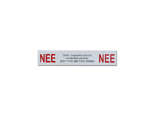 Kies nu ook voor dit unieke aluminium Nee Nee bordje. Dankzij dit aluminium Nee Nee bordje ontvangt u voortaan geen ongewenste reclame meer ontvangen. Het Nee Ja bord is gemaakt van hoogwaardig aluminium en is eenvoudig te bevestigen middels de zelfklevende strip op de achterzijde.