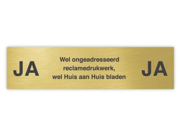 Ongewenste reclame brievenbus bordje van echt Messing. Dit JA JA bordje is het luxe alternatief voor de reclame sticker. Dit brievenbusbordje zorgt ervoor dat u reclamedrukwerk en ook huis aan huis bladen ontvangt.