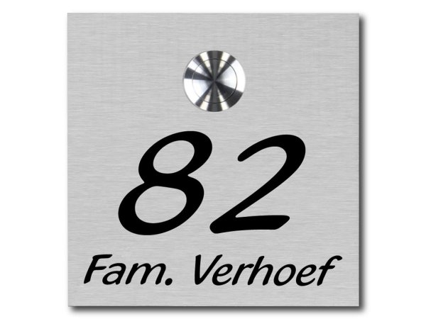 Deze rvs naamplaat heeft een afmeting van 10 x 10 cm en is voorzien van een deurbel. De gewenste opdruk wordt aangebracht middels lasergraveren en is daarom permanent. De opdruk kleur is daarom altijd antraciet / zwart van kleur.