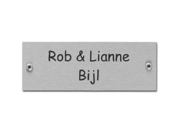 Dit naamplaatje van rvs is te bestellen met schroeven of een zelfklevende strip. Je kiest zelf de bevestiging die het best past bij de toepassing. Een zelfklevende bevestiging is handig voor montage op gladde ondergronden zoals het kozijn, voordeur of brievenbus. Maar voor een bevestiging op bakstenen of een andere ruwe ondergrond kan je beter kiezen voor schroeven.