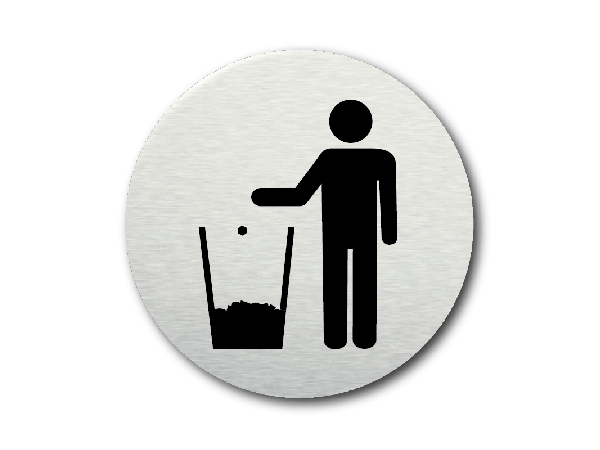Dit handige ronde pictogram vraagt u uw afval in de prullenbak te gooien. Alle basic pictogrammen zijn gemaakt van dibond voorzien van een moderne rvs look toplaag. Dit ronde pictogram heeft een afmeting van 8,5 cm en is aan de achterzijde voorzien van een zelfklevende laag.