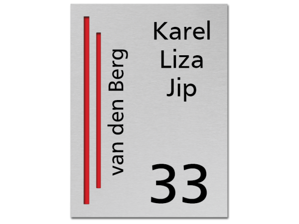 Dit rvs naambordje heeft een afmeting van 15 x 20 cm en heeft een bijzondere afwerking. Het is wellicht op de foto wat lastig te zien maar de rode stroken zijn uit het rvs gesneden. Door daar een rode achterplaat aan te brengen ontstaat een leuk rvs naambord met mooie rode accenten.